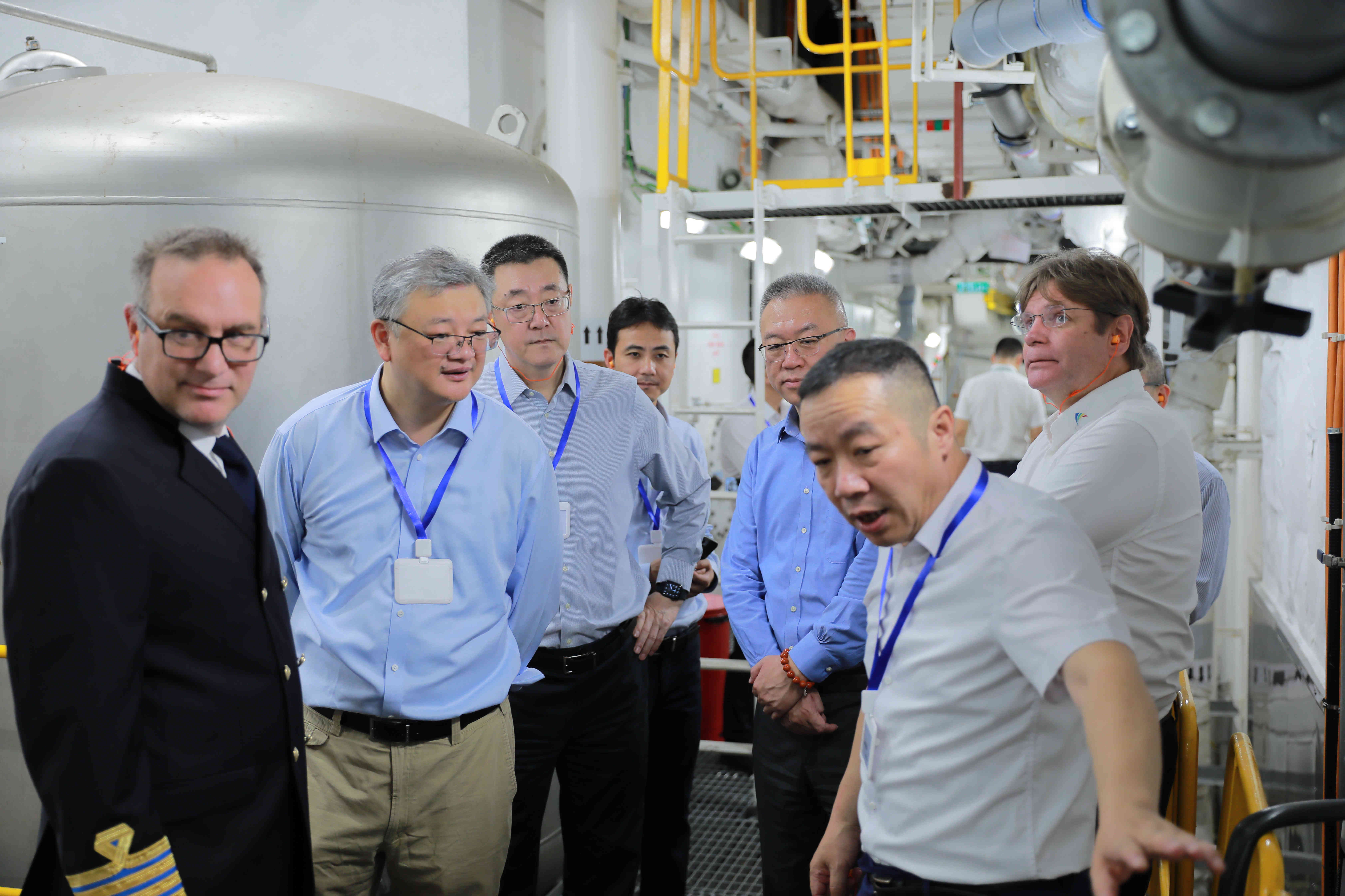 王海民充分肯定了船岸团队在船舶安全运行、维护保养、客舱服务等方面所作的努力。在驾驶台,王海民详细了解双节期间航行计划、天气情况、导航设备以及恶劣天气应急处置预案等情况。在集控室与机舱,实地检查了设施设备维护保养等情况。在后厨,细致询问厨房工作人员有关食材采购、操作流程以及食品安全等情况。调研期间,王海民与上海外高造船公司董事长陈刚、国家京剧院院长王勇分别就优化邮轮安全管理体系、打造邮轮文旅融合产品等进行交流。