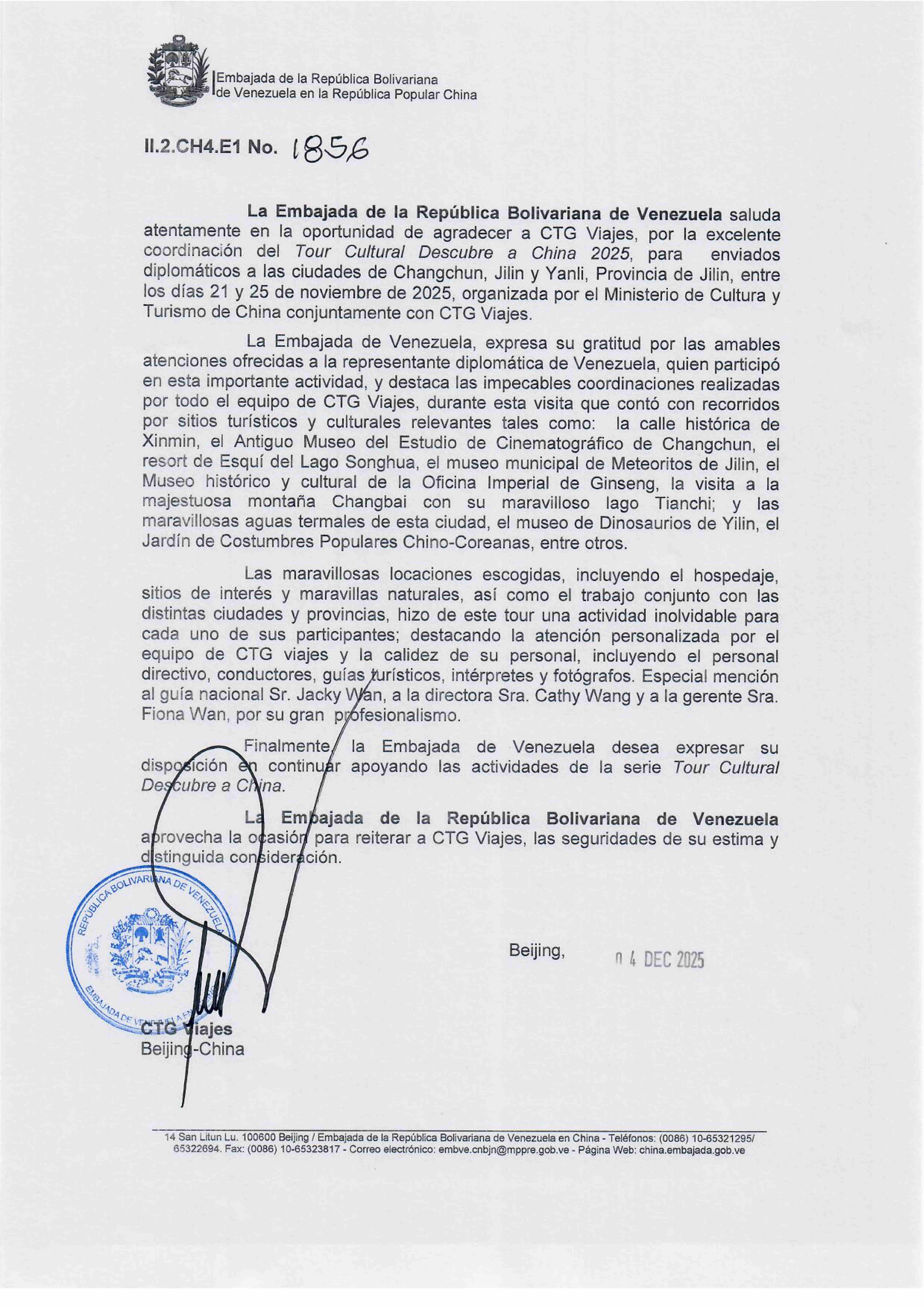12月5日,中旅旅行所属中旅入境收到委内瑞拉驻华大使馆发来的感谢信,对中旅入境在2025驻华外交官“发现中国之美·相约冰雪吉林”活动期间的精心组织与热情接待表示感谢。